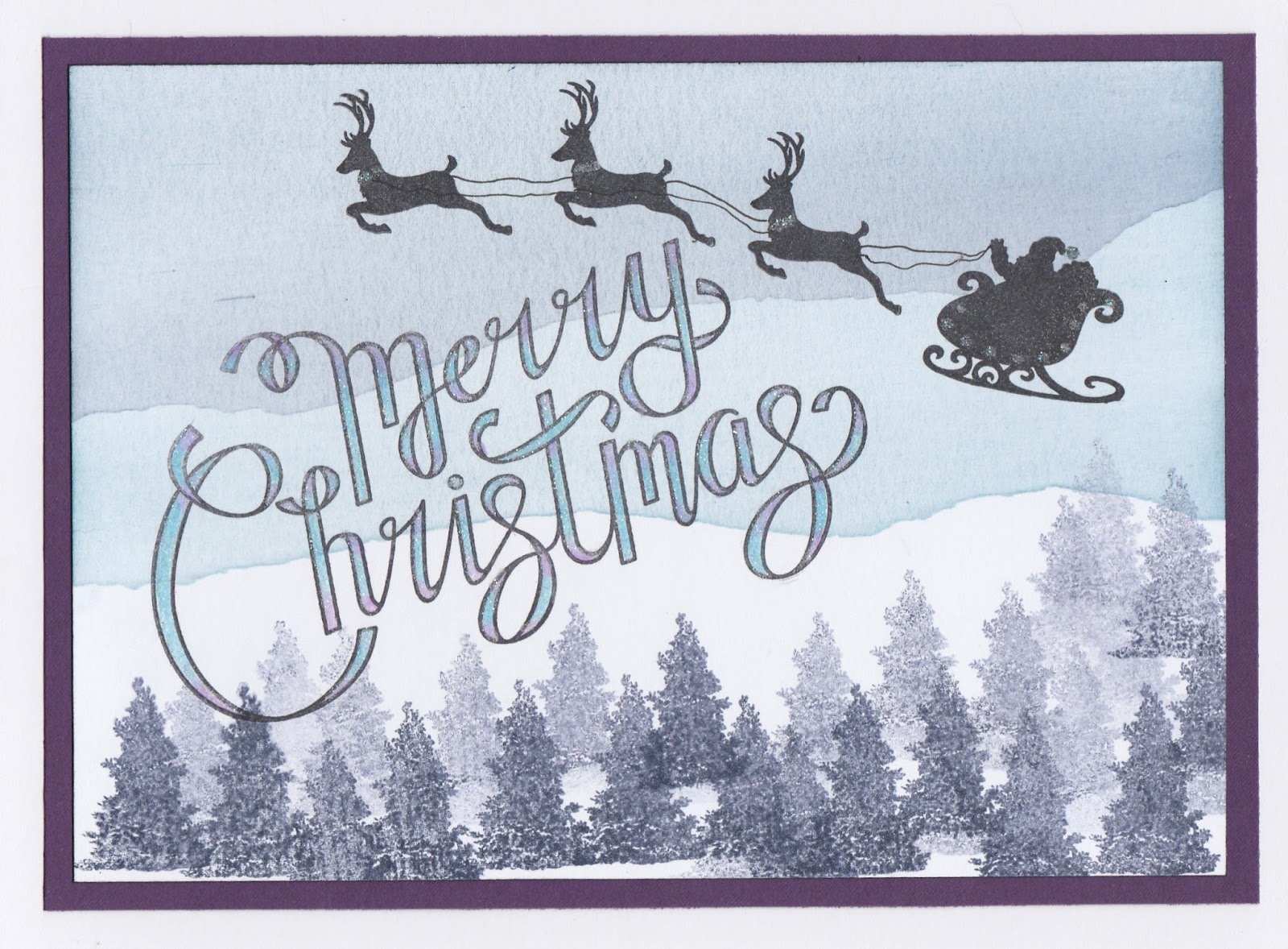 I coloured in the Merry Christmas with matching Spectrum Noir pencils with glitter over the top, and added touches of glitter on the sleigh and reindeer.